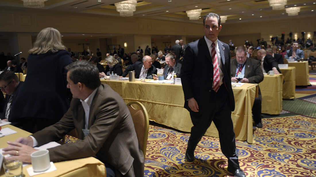 Republican National Committee Chairman Reince Priebus walks around the room Friday at the RNC winter meeting in Washington.