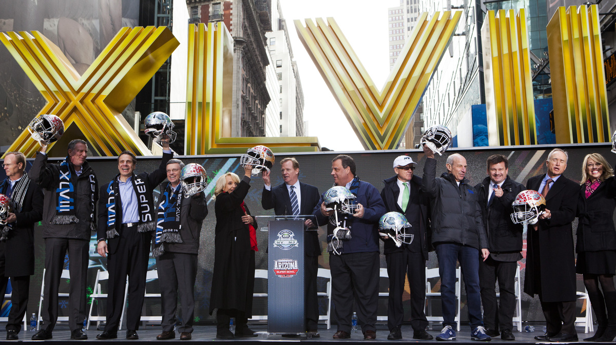 New York and national politicians join the NFL Super Bowl host committee in New York's Times Square Saturday. When it comes to political contributions, the owners of Sunday's Super Bowl contenders are plenty active. Christopher Gregory/Getty Images hide caption