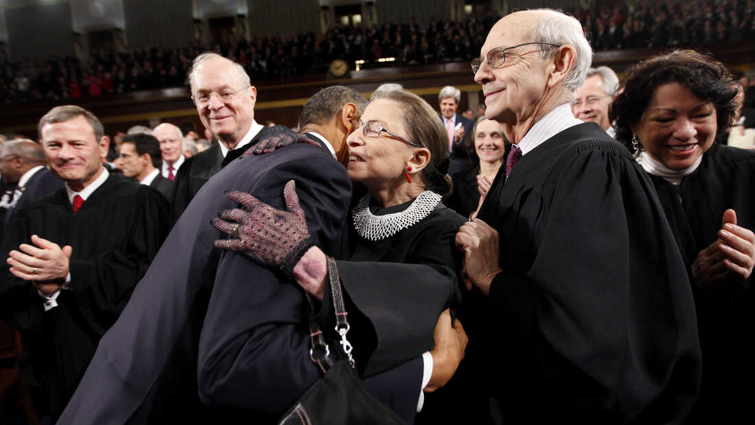 President Obama hugs Justice Ruth Bader Ginsburg prior to delivering his 2011 State of the Union address. Pablo Martinez Monsivais/AP hide caption