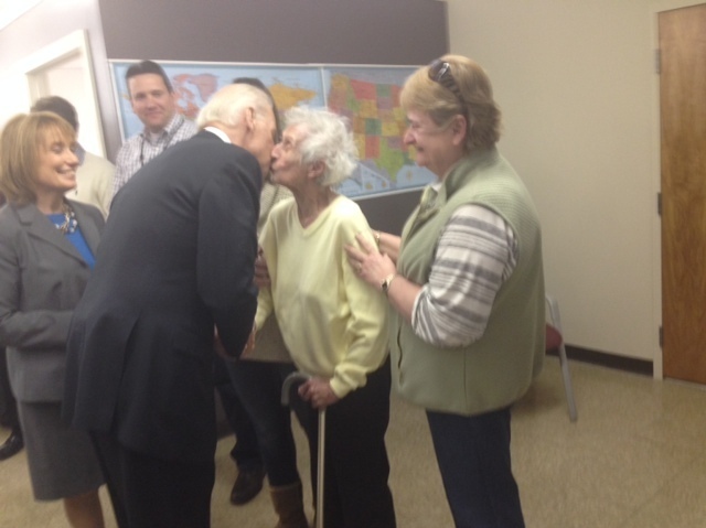 Vice President Biden greets Enis Sullivan, 101, with a kiss Tuesday in New Hampshire.