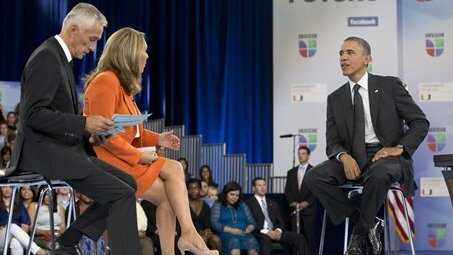 President Obama participates in a 2012 town hall hosted by Univision with news anchors Jorge Ramos and Maria Elena Salinas. A conservative media watchdog group says the Spanish-speaking network is biased in favor of Obama and liberals. Carolyn Kaster/AP hide caption