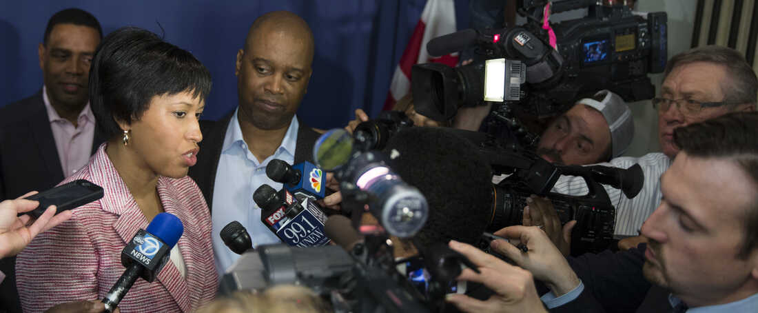 Muriel Bowser, the Democratic mayoral nominee in Washington, D.C., talks with reporters after a Wednesday news conference at the National Press Club in Washington. Evan Vucci/AP hide caption