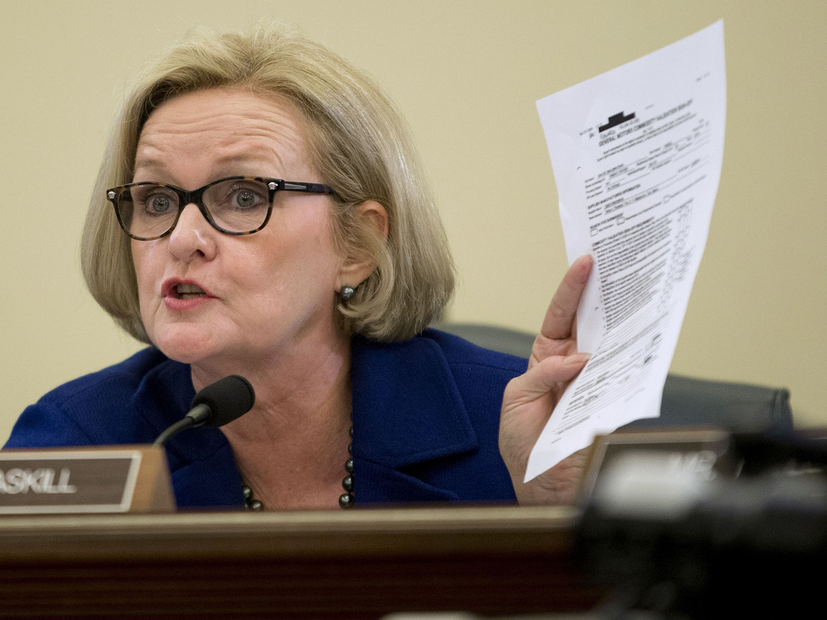 Sen. Claire McCaskill, D-Mo., holds up a document during an April 2 subcommittee hearing.