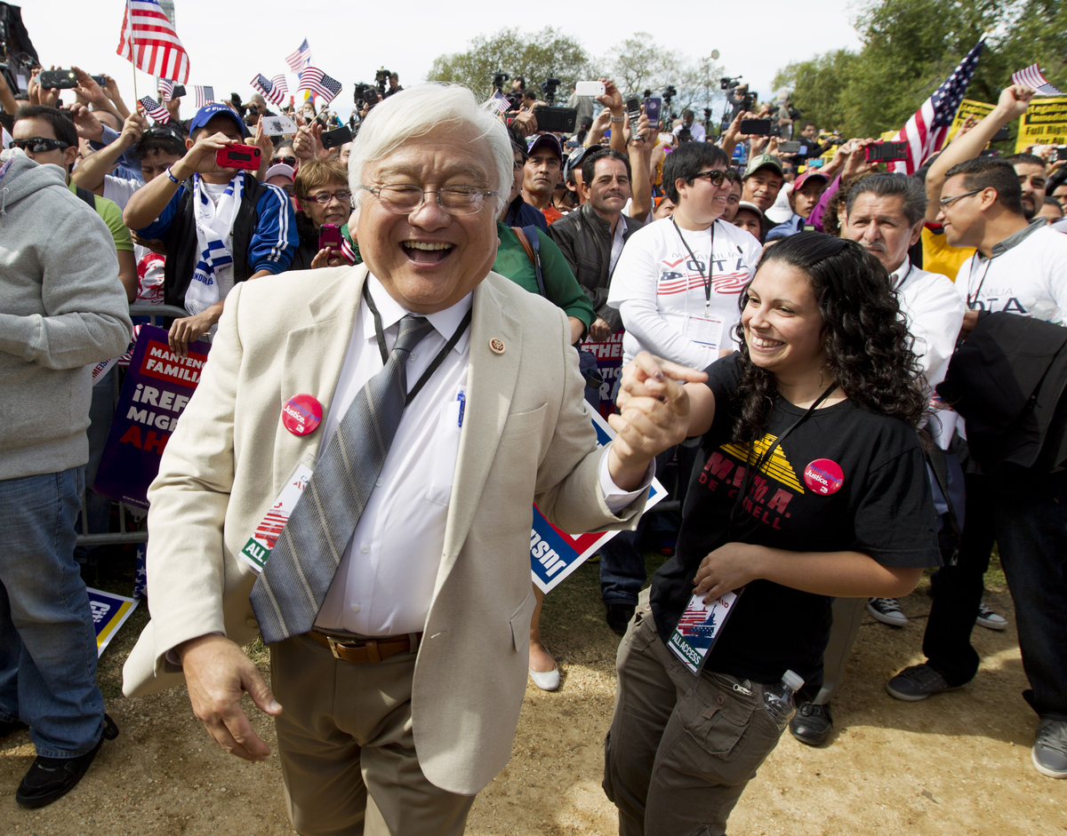 Rep. Mike Honda, D-Calif., dances to the music of Los Tigres del Norte during an immigration rally on the National Mall in Washington in October 2013.