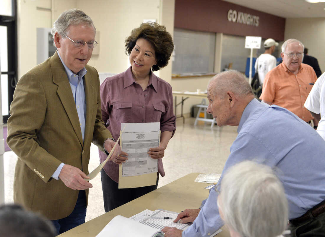 Kentucky Republican Senator Mitch McConnell, left, and his wife Elaine Chao, center, talk with poll workers at their precinct Tuesday, May 20, 2014, at Bellarmine University in Louisville, Ky. Timothy D. Easley/AP hide caption