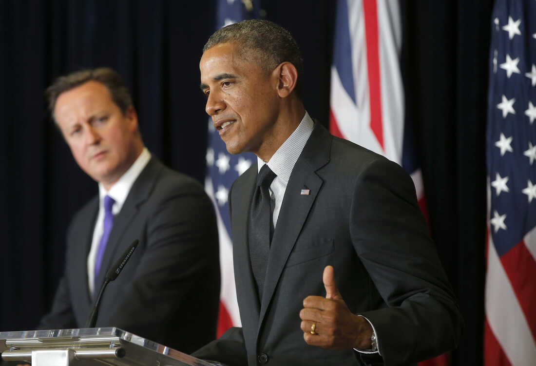 President Obama at the news conference in Brussels at which he was asked if he had second thoughts about how he and his aides handled the Bergdahl deal announcement. British Prime Minister David Cameron is in the background. Charles Dharapak/AP hide caption