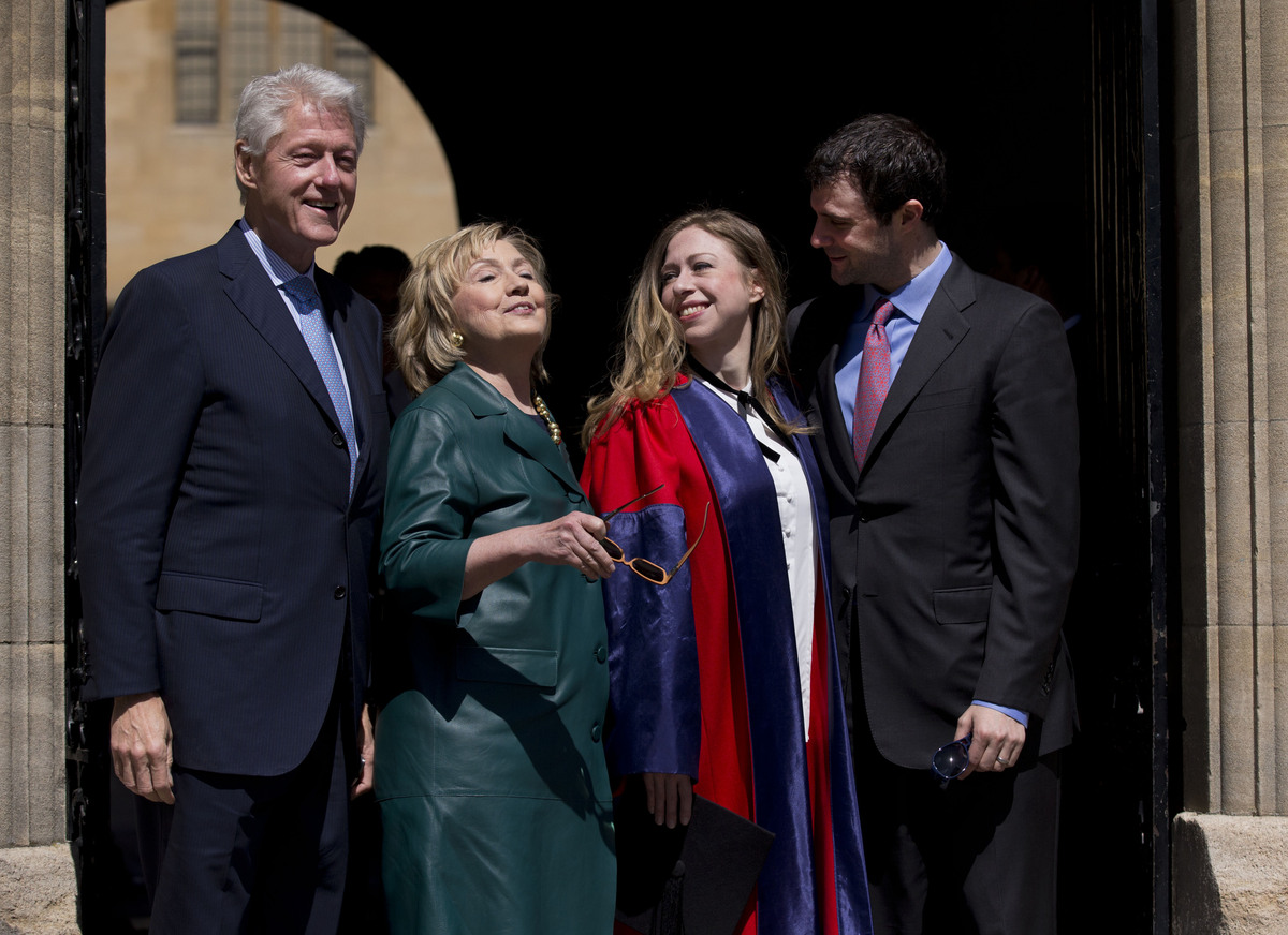 Hillary Clinton poses for a family photo with former President Bill Clinton, daughter Chelsea, and son-in-law Marc Mezvinsky, after attending Chelsea's Oxford University graduation ceremony last month. Matt Dunham/AP hide caption