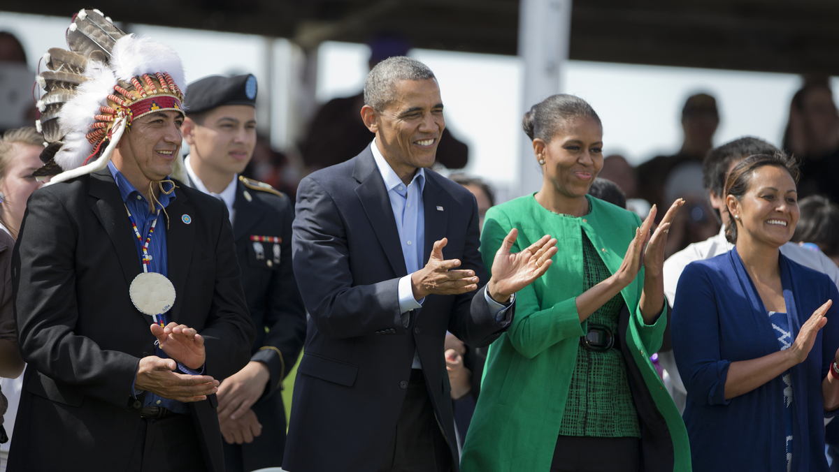 President Barack Obama, first lady Michelle Obama, and Standing Rock Sioux Tribal Nation Chairman Dave Archambault II, left, and his wife Nicole Archambault, right, applaud as they watch a Cannon Ball flag day celebration, at the Cannon Ball powwow grounds in Cannon Ball, N.D., on June 13.