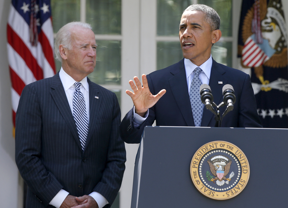 President Obama, accompanied by Vice President Biden in the White House Rose Garden, lashed out at House Republicans for stalling immigration legislation. Charles Dharapak/AP hide caption