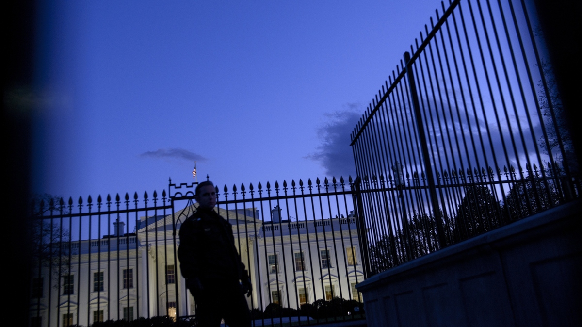 A member of the Secret Service's uniformed division stands by a fence in front of the White House.