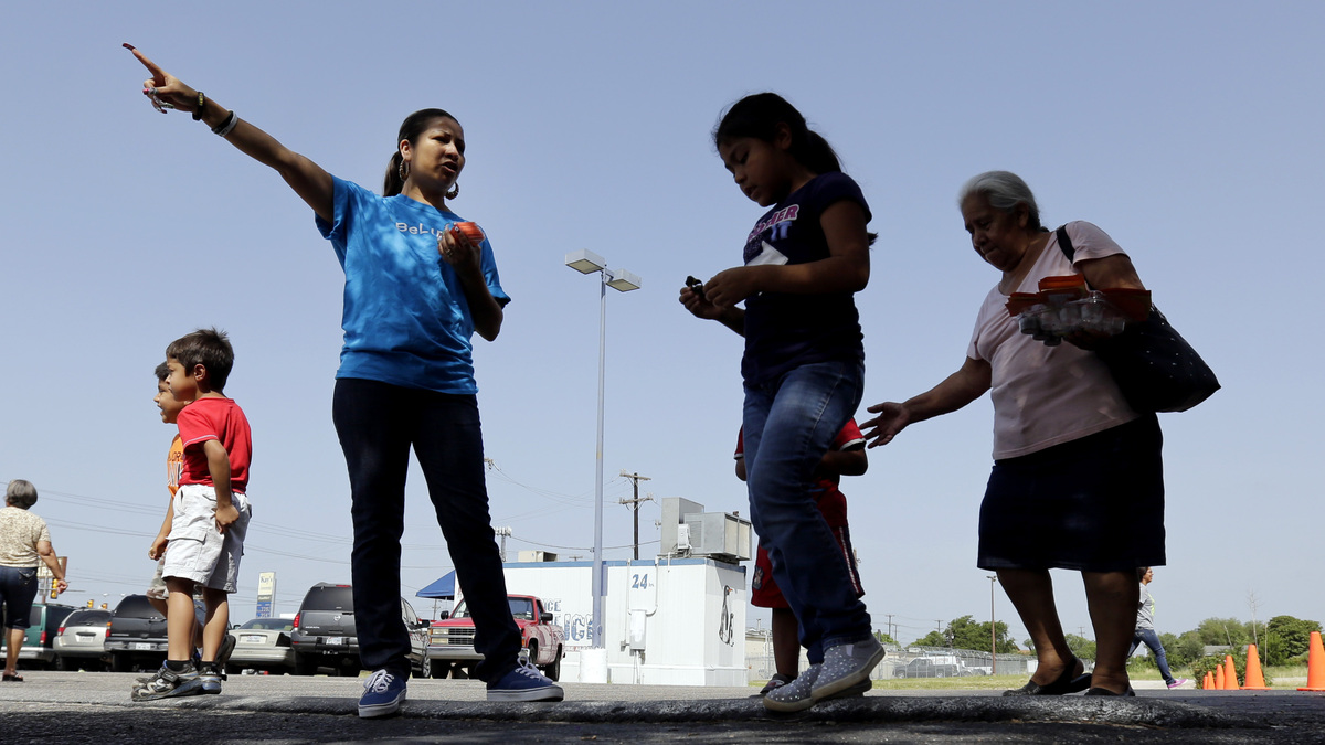 A volunteer with the Koch-funded Libre Initiative directs people in 2014 as groceries are distributed at a food bank it partially sponsors in San Antonio.