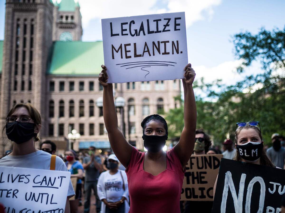 Protesters hold signs outside the Hennepin county Government Center in Minneapolis, Minn., on Thursday.