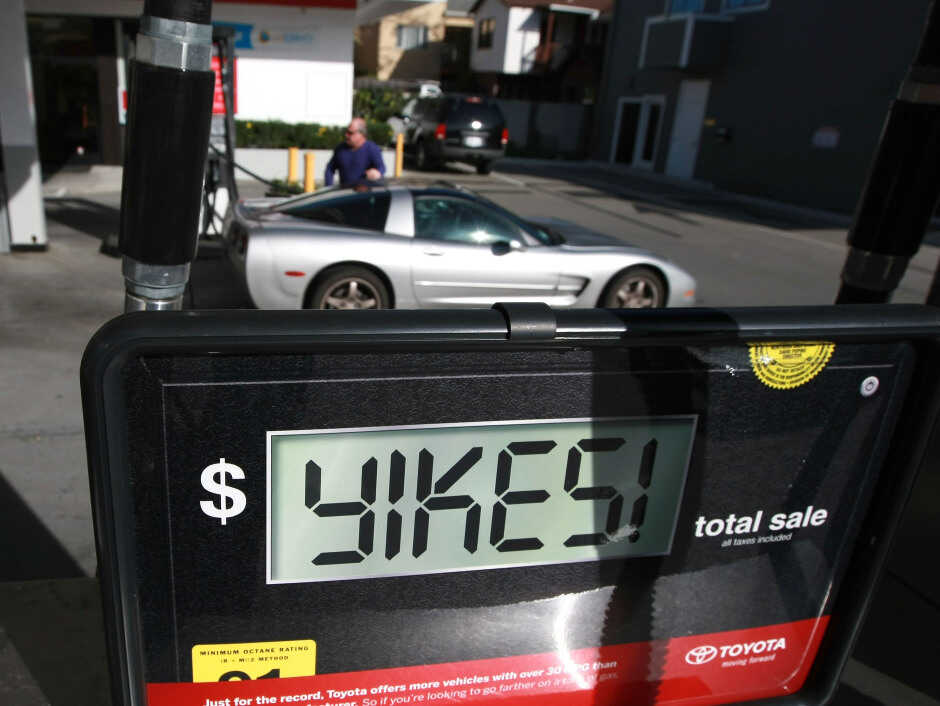Note: The photo shows a clever Toyota ad, not an actual gas pump that's gone haywire. Justin Sullivan/Getty Images hide caption