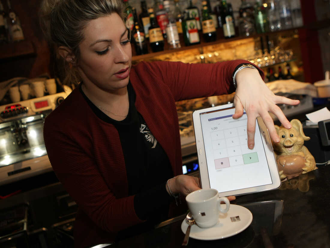 A waitress shows how to pay for a coffee with bitcoins. PIERRE TEYSSOT/AFP/Getty Images hide caption
