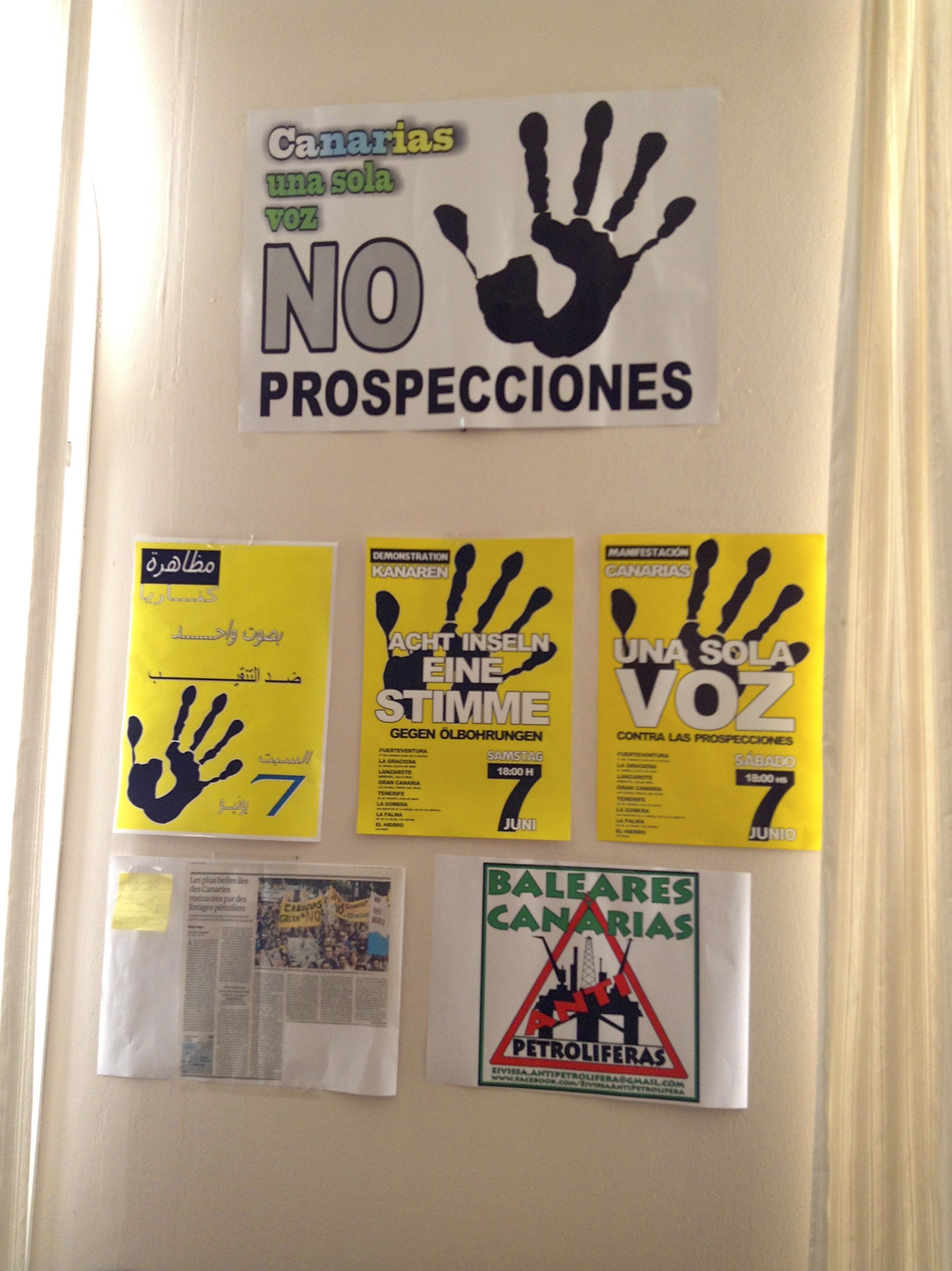 Local activists have printed posters in several languages (here shown in Spanish, Arabic and German) to try to convince tourists and locals to oppose oil drilling in the Canary Islands.