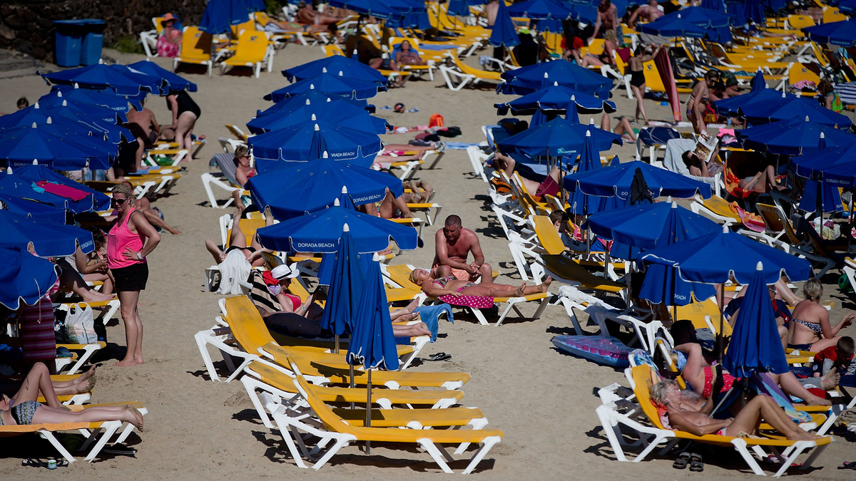 Tourists lay on rows of sun umbrellas on Playa Blaca beach on April 13 in Lanzarote, Spain. Oil exploration began recently in the waters off the coast of the popular tourist destination, despite the opposition of the local residents and government, and environmental organizations.