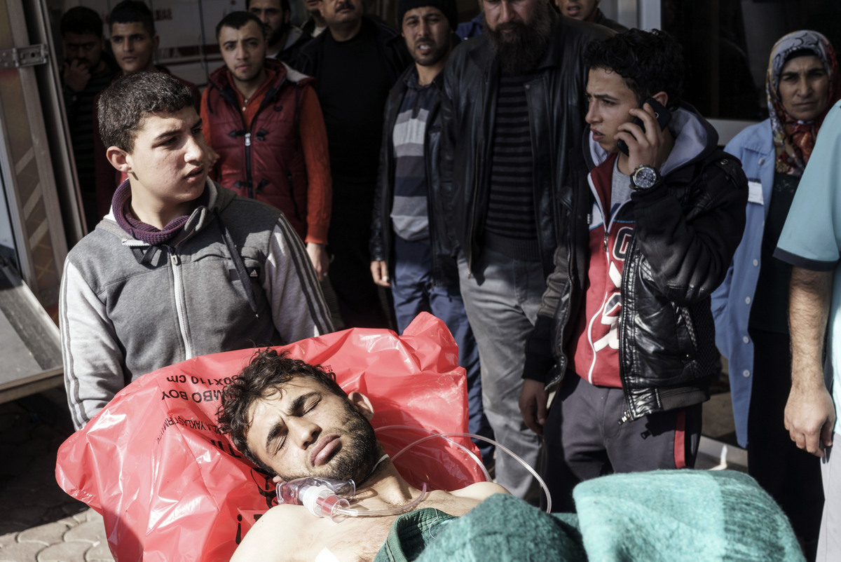 A wounded Syrian man is carried to a hospital in Kilis, Turkey, just across the border from Syria, last month. The protests against Syrian President Bashar al-Assad began five years ago this month, evolving into a multi-sided civil war.