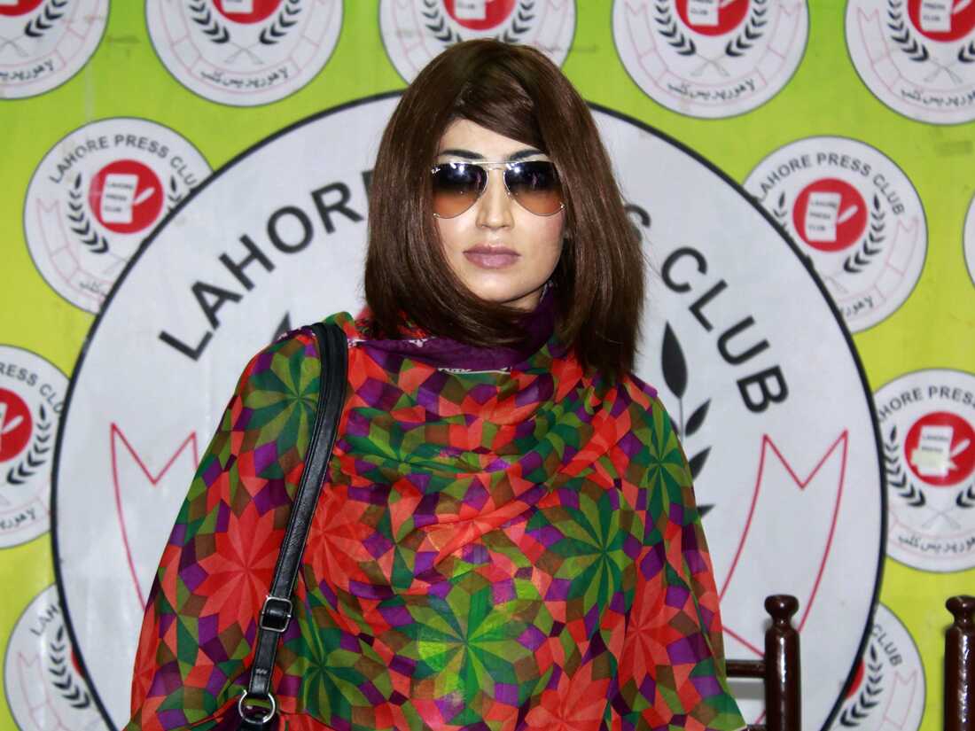 Qandeel Baloch, a Pakistani social media celebrity shown here at a June 28 press conference in Lahore, was murdered by her brother in an honor killing on July 15. STR/AFP/Getty Images hide caption