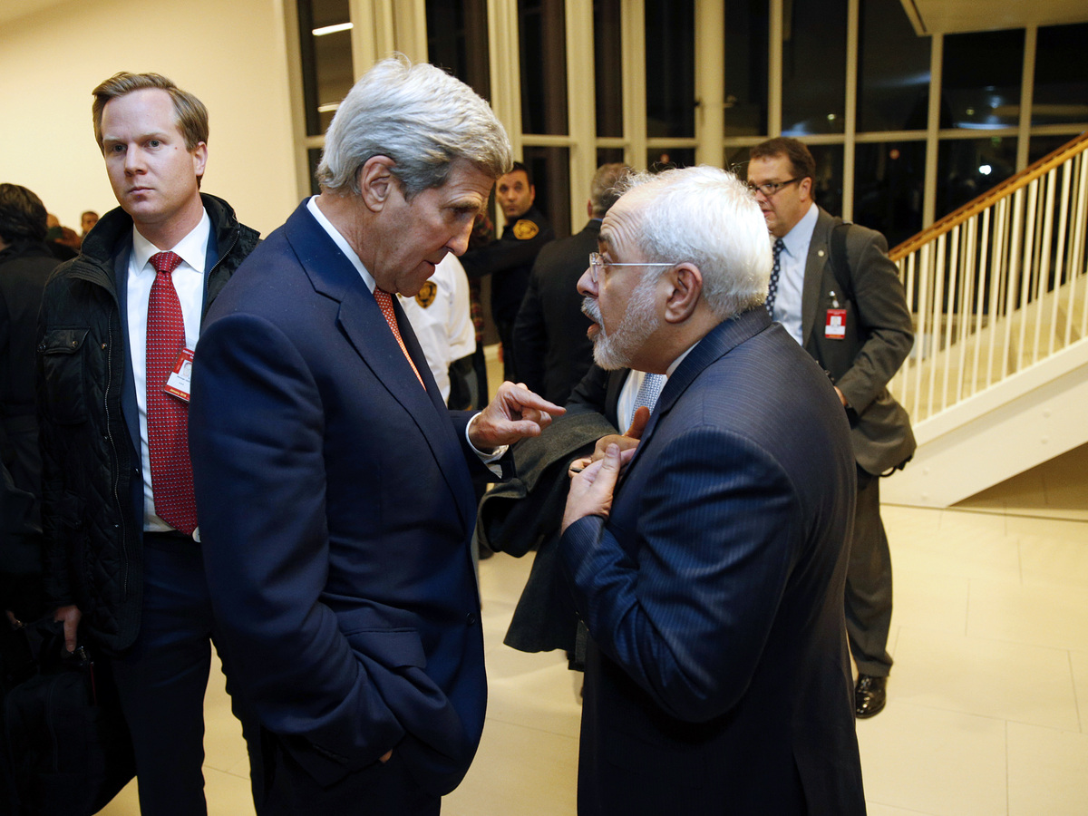 Secretary of State John Kerry speaks with Iranian Foreign Minister Mohammad Javad Zarif in Vienna on Jan. 16. The nuclear accord between Iran and major powers entered into force as the U.N. confirmed that Tehran had shrunk its atomic program and sanctions were lifted.