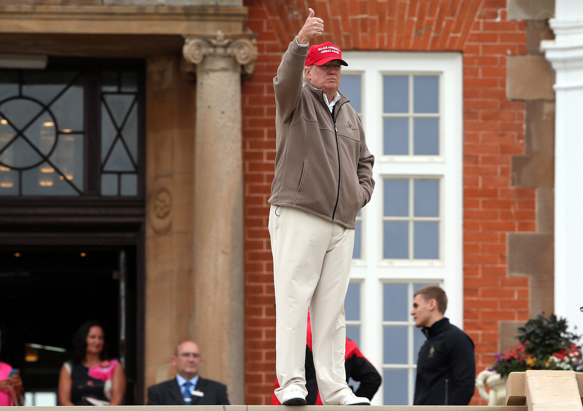 President-elect Donald Trump gestures during a visit to the golf course he owns in Turnberry, Scotland, on July 31, 2015. As president, Trump will face foreign policy decisions that are likely to have an impact on his extensive international holdings, but he says he has no plans to sell his foreign business interests.