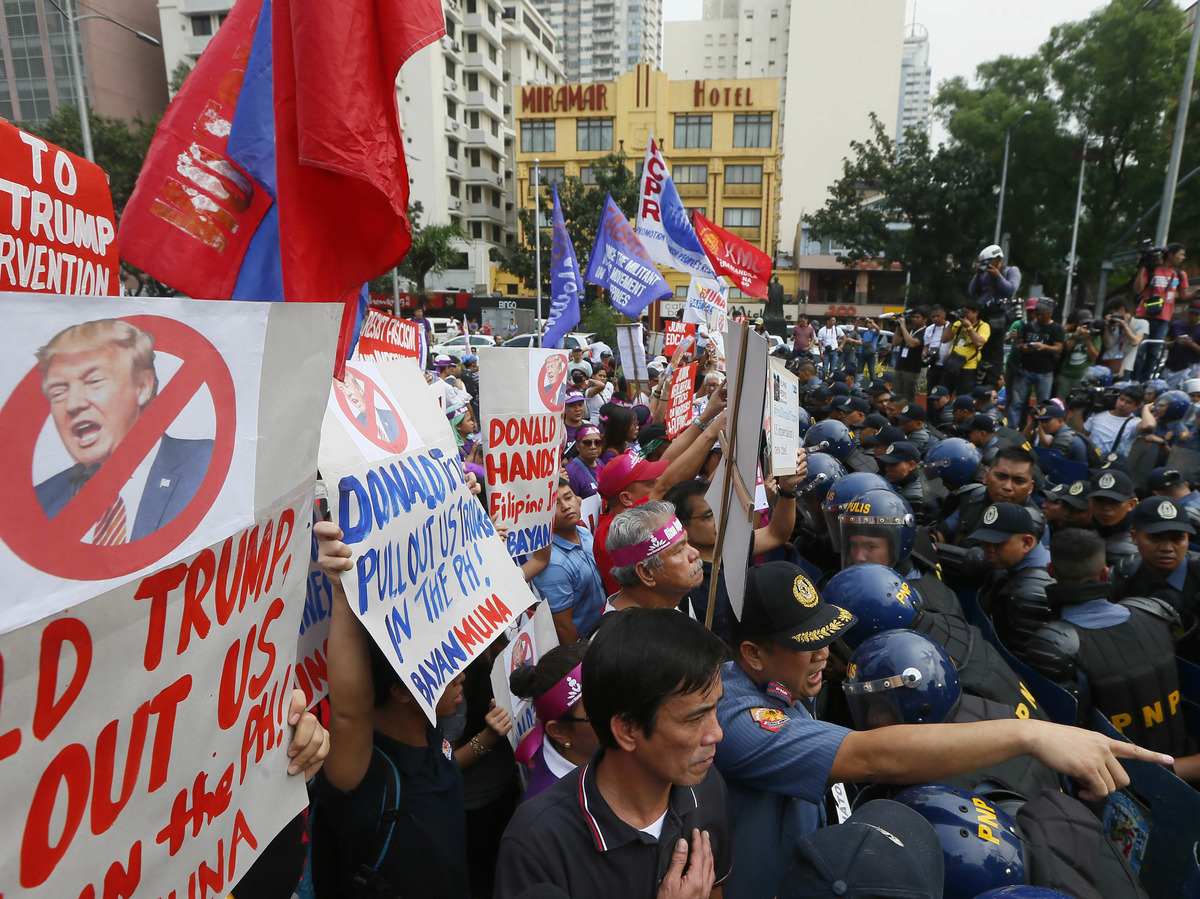 Abbas Momani/AFP/Getty ImagesDemonstrators in the Philippines burned U.S. flags and rallied against Trump outside the U.S. Embassy in Manila. They demanded an end to U.S. troop presence in the Philippines. Trump has praised the Philippine president, Rodrigo Duterte, whose ongoing anti-drug campaign has left more than 5,000 dead since last June.