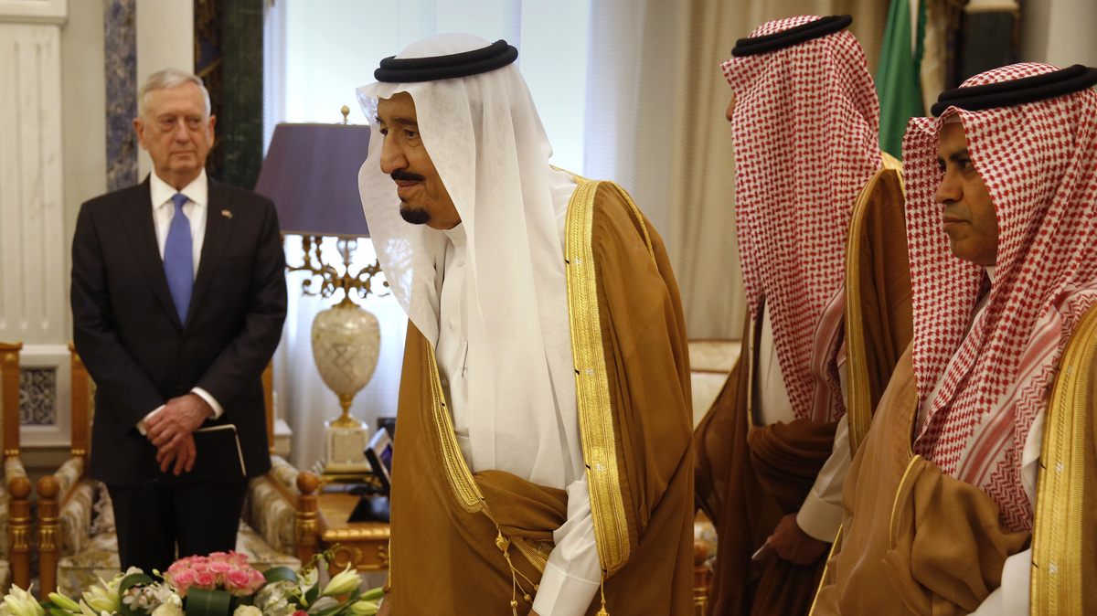 Saudi Arabia's King Salman welcomes U.S. Defense Secretary James Mattis in Riyadh on April 19. Jonathan Ernst/AP hide caption