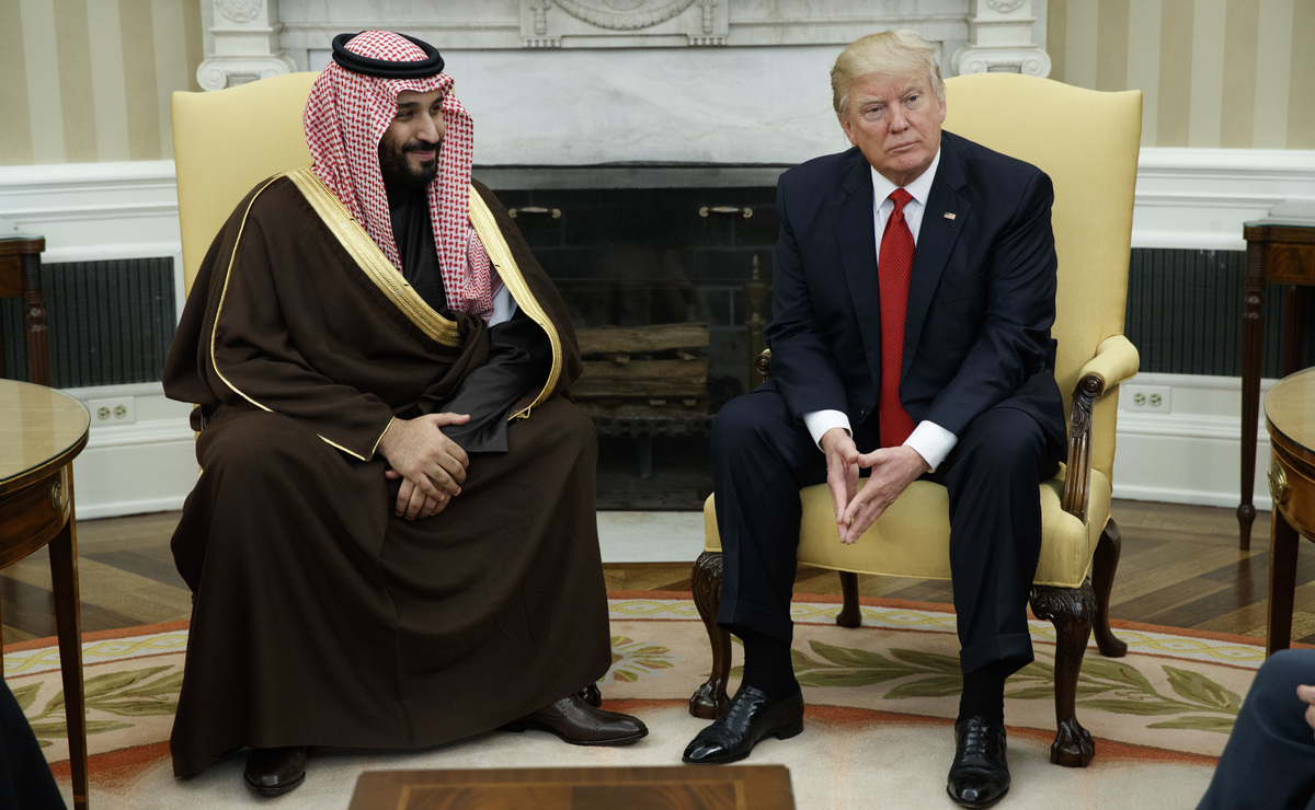 President Trump meets Saudi Arabia's Deputy Crown Prince Mohammed bin Salman in the Oval Office on March 14. Trump is traveling to the kingdom Friday on his first foreign trip. Evan Vucci/AP hide caption