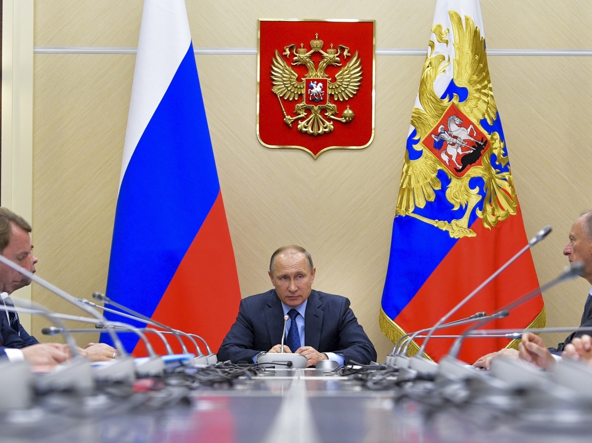 Russian President Vladimir Putin chairs a meeting of the Commission for Military Technology Cooperation outside Moscow on Thursday, ahead of Friday's G-20 meeting in Hamburg. Alexei Druzhinin/AP hide caption