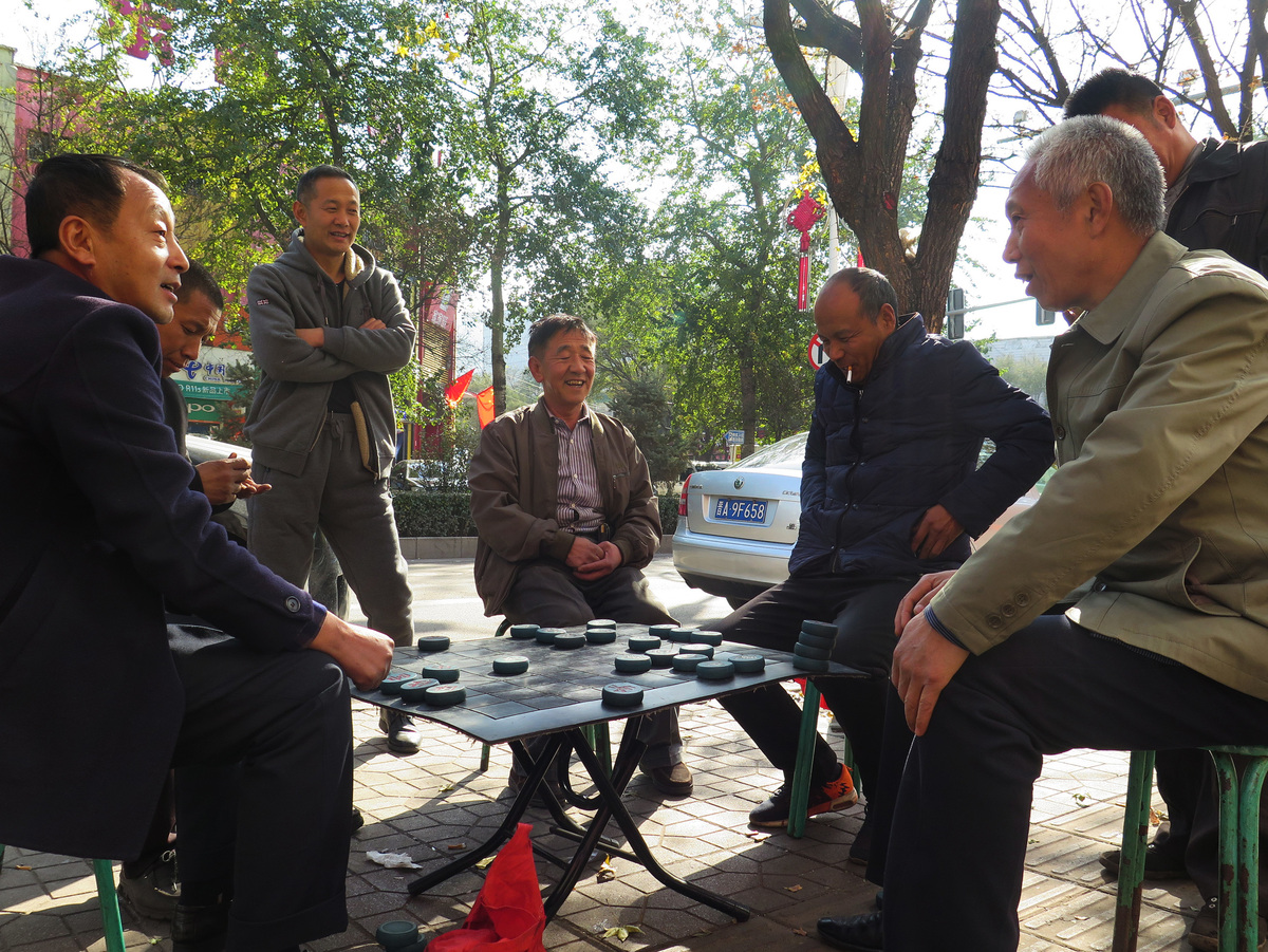 Men play Chinese chess on the sidewalk in the coal mining town of Gujiao.