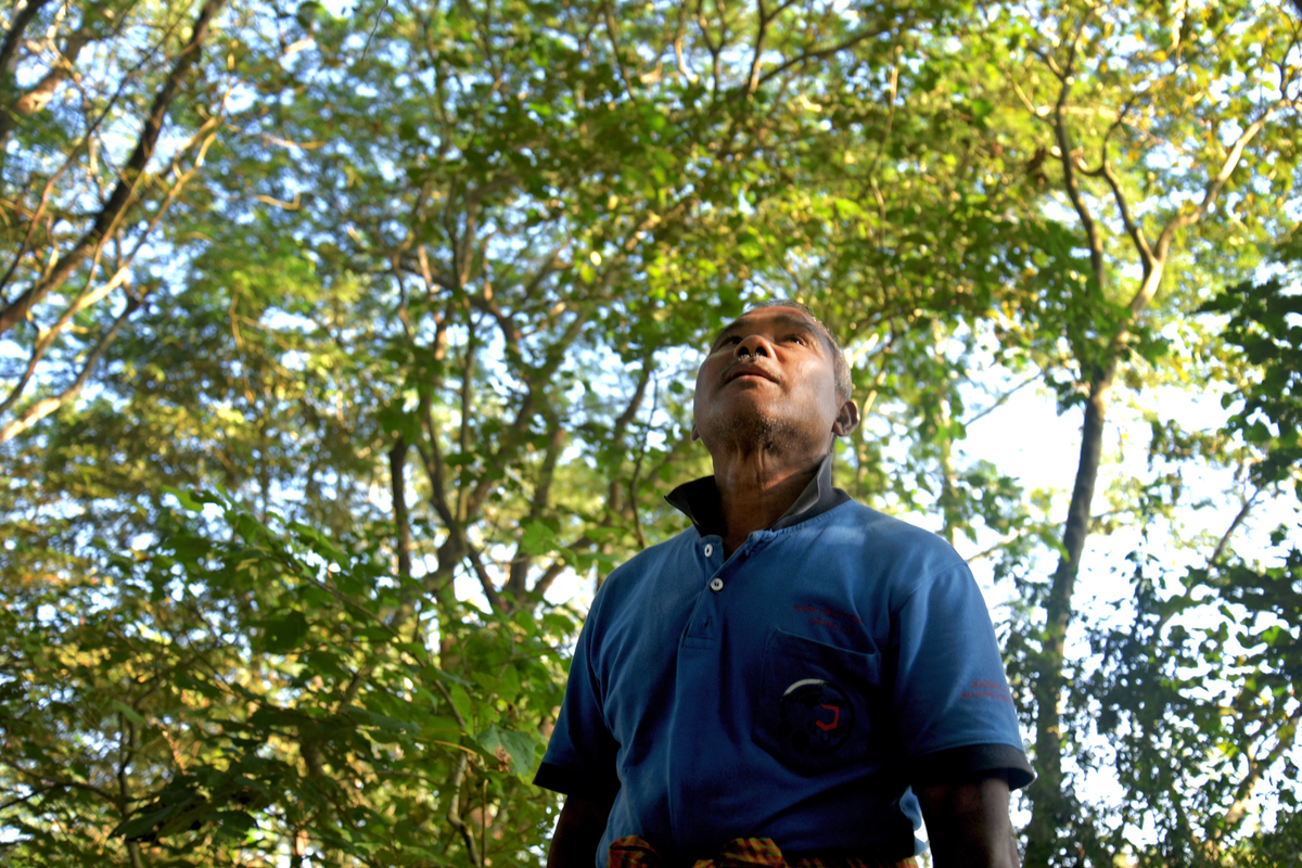 Payeng guides us to some of the oldest trees he's planted. Beneath a high canopy he leans against a 30-year-old teak tree with fresh scratches on the bark where a tiger has sharpened its claws.