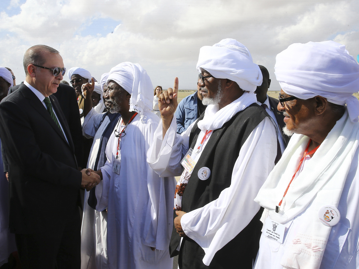 Turkey's President Recep Tayyip Erdogan shakes hands with local people in Port Sudan, Sudan, on Dec. 25, one of many locations in Africa the Turkish leader has visited recently. Kayhan Ozer/AP hide caption