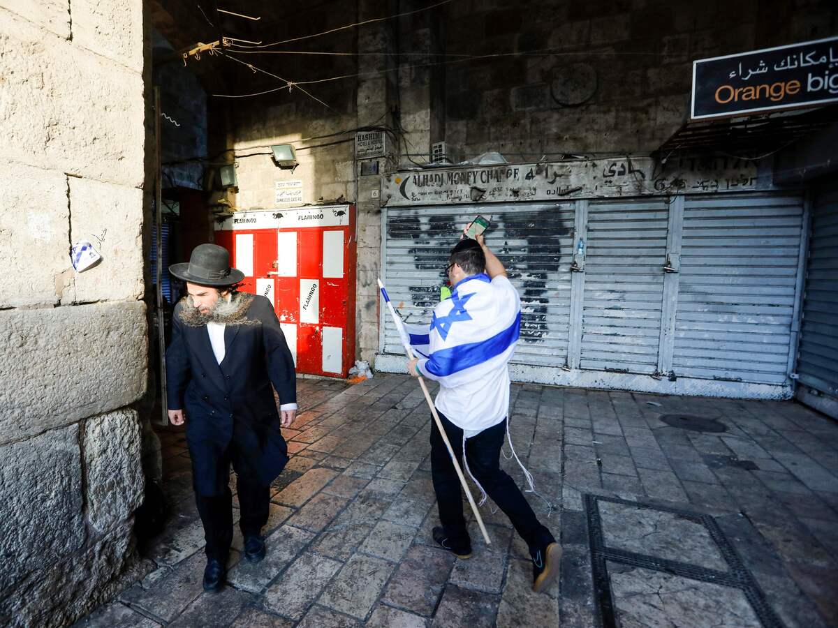 An Israeli draped in the national flag walks past an ultra-Orthodox Jewish man in Jerusalem's Old City on May 13, as Israelis marked Jerusalem Day.