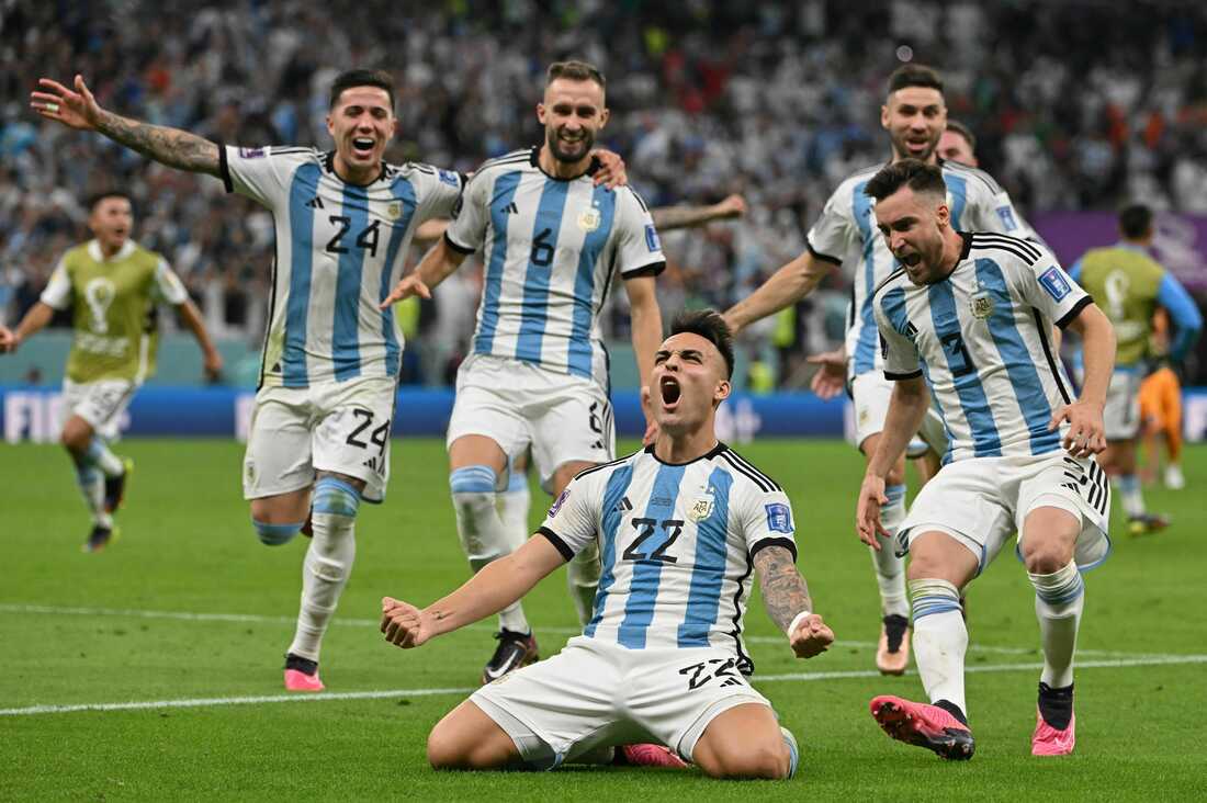 Argentina forward Lautaro Martínez (No. 22) celebrates after scoring in a penalty shoot-out to defeat the Netherlands in a 2022 World Cup quarterfinal match on Friday, Dec. 9, at the Lusail Stadium, north of Doha, Qatar. Alberto Pizzoli/AFP via Getty Images hide caption