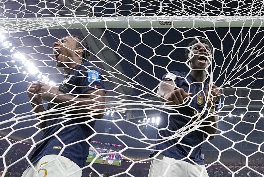 France's Jules Koundé, left, and Aurelien Tchouameni, right, celebrate their victory after a World Cup semifinal match with Morocco on Wednesday, Dec. 14, at the Al Bayt Stadium in Al Khor, Qatar. France won, 2-0. Manu Fernandez/AP hide caption