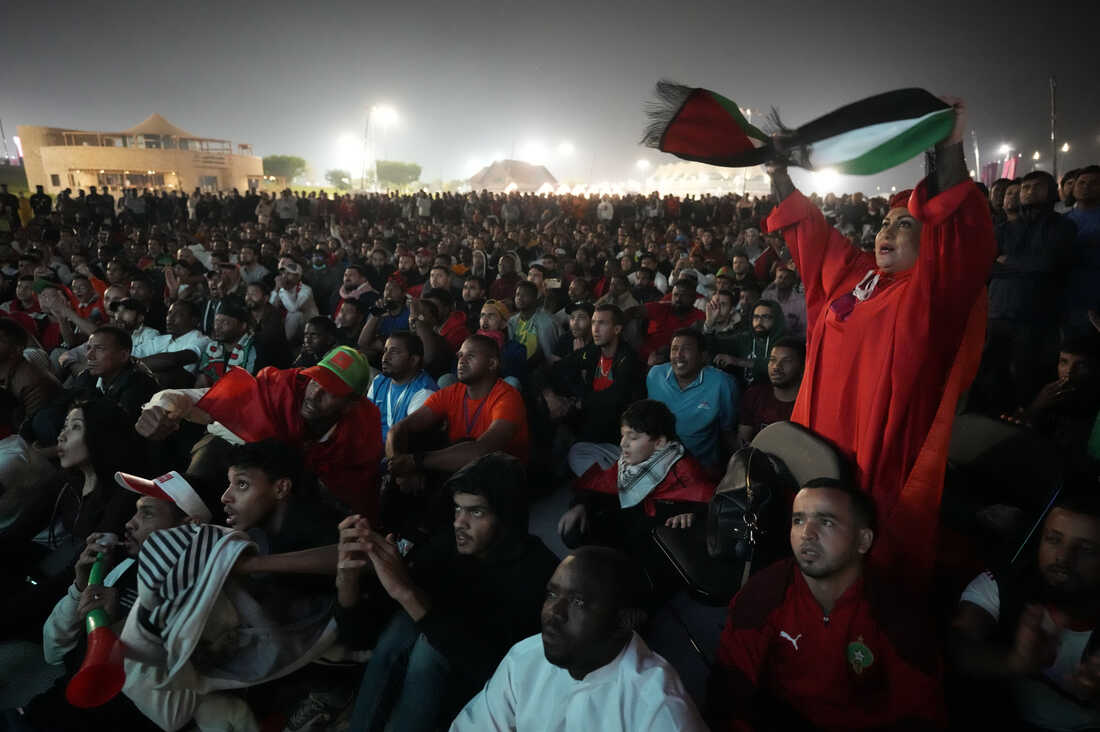 Morocco's fans, one waving a Palestinian flag, watch a World Cup semifinal match with France on Wednesday, Dec. 14, outside the Al Bayt Stadium in Doha, Qatar. Frank Augstein/AP hide caption