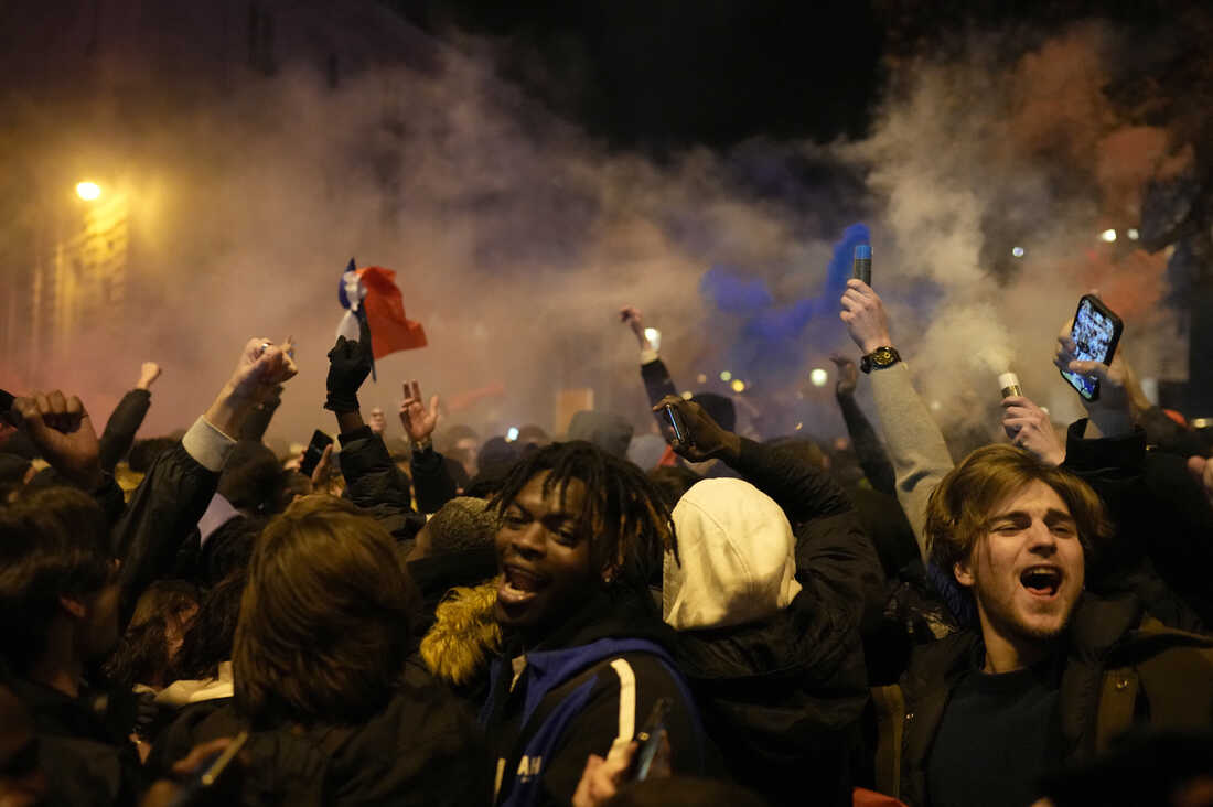 France's fance react next to the Arc de Triomphe on the Champs-Élysées avenue at the end of a World Cup semifinal match with Morocco on Wednesday, Dec. 14, in Paris. Thibault Camus/AP hide caption