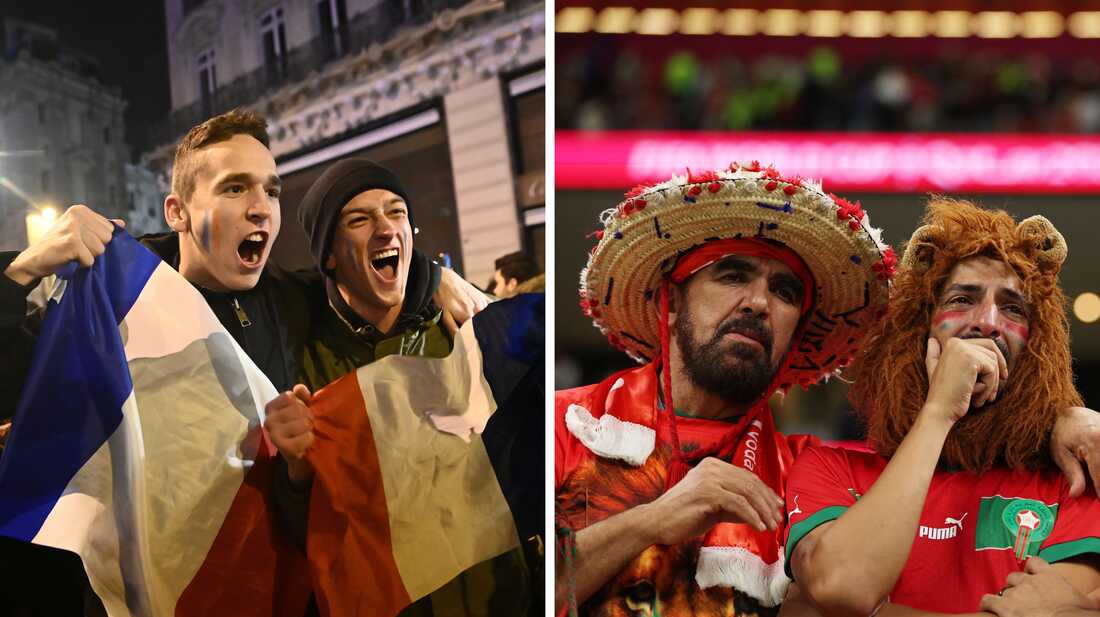 Left: France's fans celebrate their victory at Champs-Élysées in Paris after France defeated Morocco in a 2022 World Cup semifinal match on Wednesday, Dec. 14. Right: Morocco's fans react after the team lost, 2-0, in a semifinal match with France on Wednesday, Dec. 14, at the Al-Bayt Stadium in Al Khor, north of Doha, Qatar. Julien Mattia/Anadolu Agency via Getty Images; Adrian Dennis/AFP via Getty Images hide caption