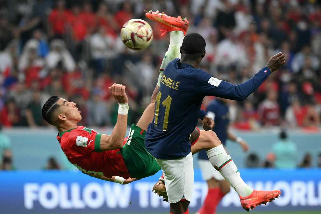 Moroccan defender Jawad El Yamiq (No. 18) attempts a shot as he's marked by French forward Ousmane Dembélé (No. 11) during a 2022 World Cup semifinal match on Wednesday, Dec. 14, at the Al-Bayt Stadium in Al Khor, Qatar. The attempted shot almost changed the course of the match. Franck Fife/AFP via Getty Images hide caption