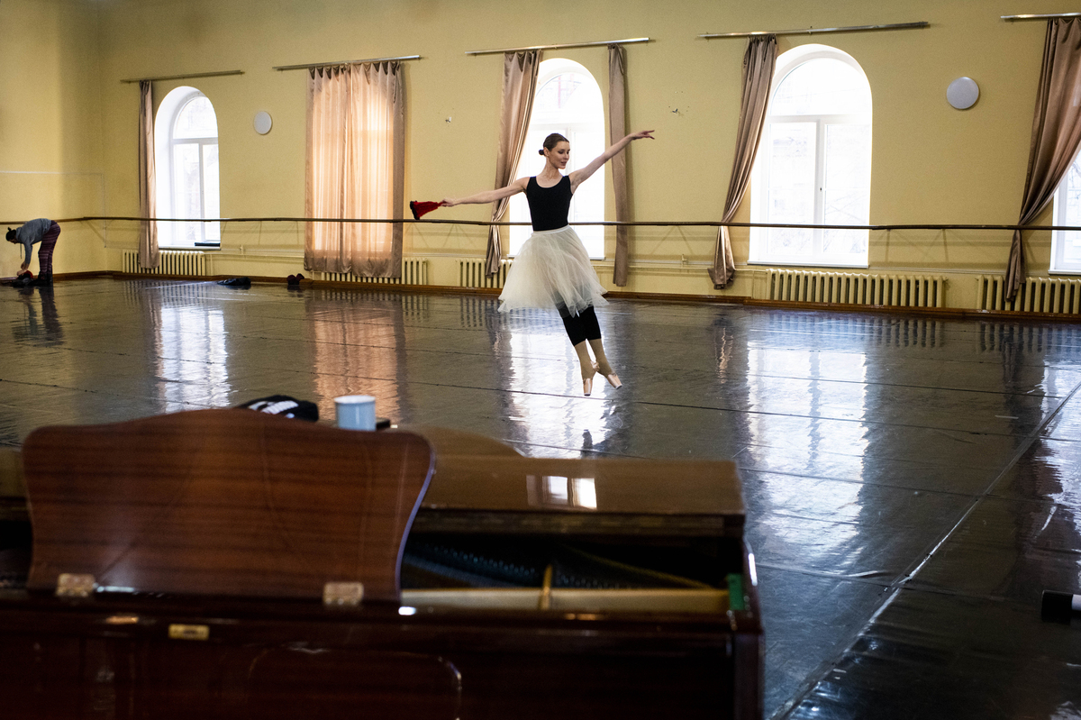 Prima ballerina Olga Golytsia rehearses on Dec. 4 at the National Opera in Kyiv for a production by the Kyiv National Ballet of The Snow Queen. This year, it is being performed without music by Russian composers Pyotr Tchaikovsky and Sergei Prokofiev.