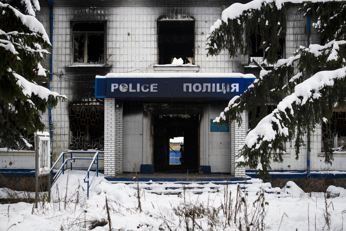 A burnt-out police station in Borodyanka, Kyiv Oblast, Ukraine on Dec. 5. Borodyanka was occupied by Russian forces during their failed attempt to take the capital.
