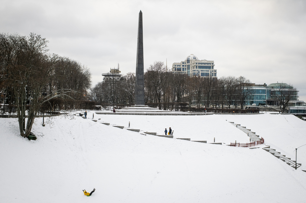 People sled on a hill in the Park of Eternal Glory adjacent to the Tomb of the Unknown Soldier in Kyiv on Nov. 30.
