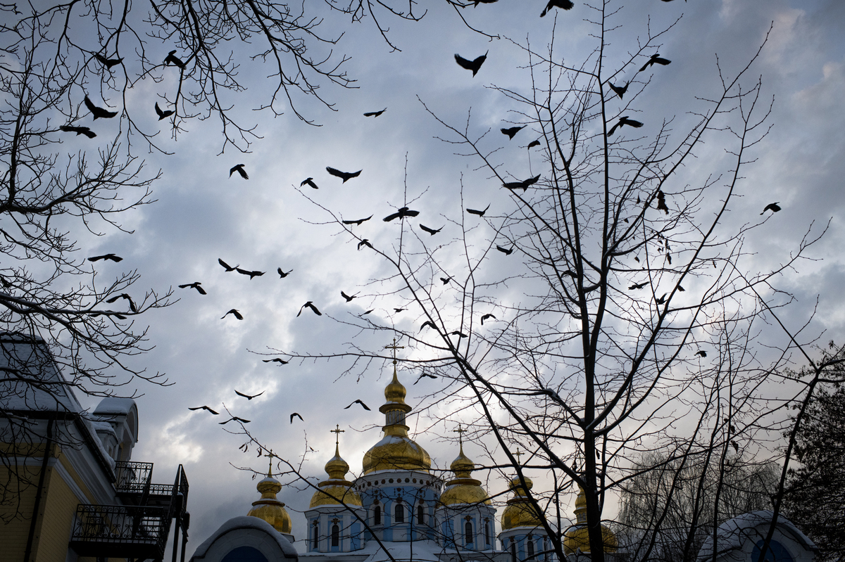 Birds fly over St. Michael's Golden-Domed Monastery in Kyiv on Nov. 30.