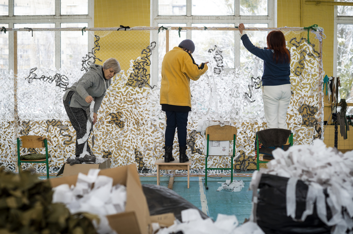 Volunteers in a school gymnasium in the Kyiv suburb of Bucha weave camouflage netting for use by the military, on Dec. 2. The group said they have created over 4,000 square yards of netting since starting their project after the liberation of Bucha. They have also created 8 sniper suits, known as "ghillie suits" — camouflaged outfits that help snipers blend into their surroundings.