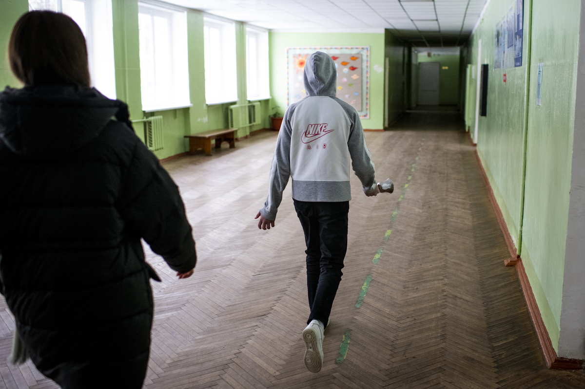 Students at a school in Bucha use a handheld bell to signal it's time for their next class on Dec. 2. The bells are necessary due to the lack of electricity.