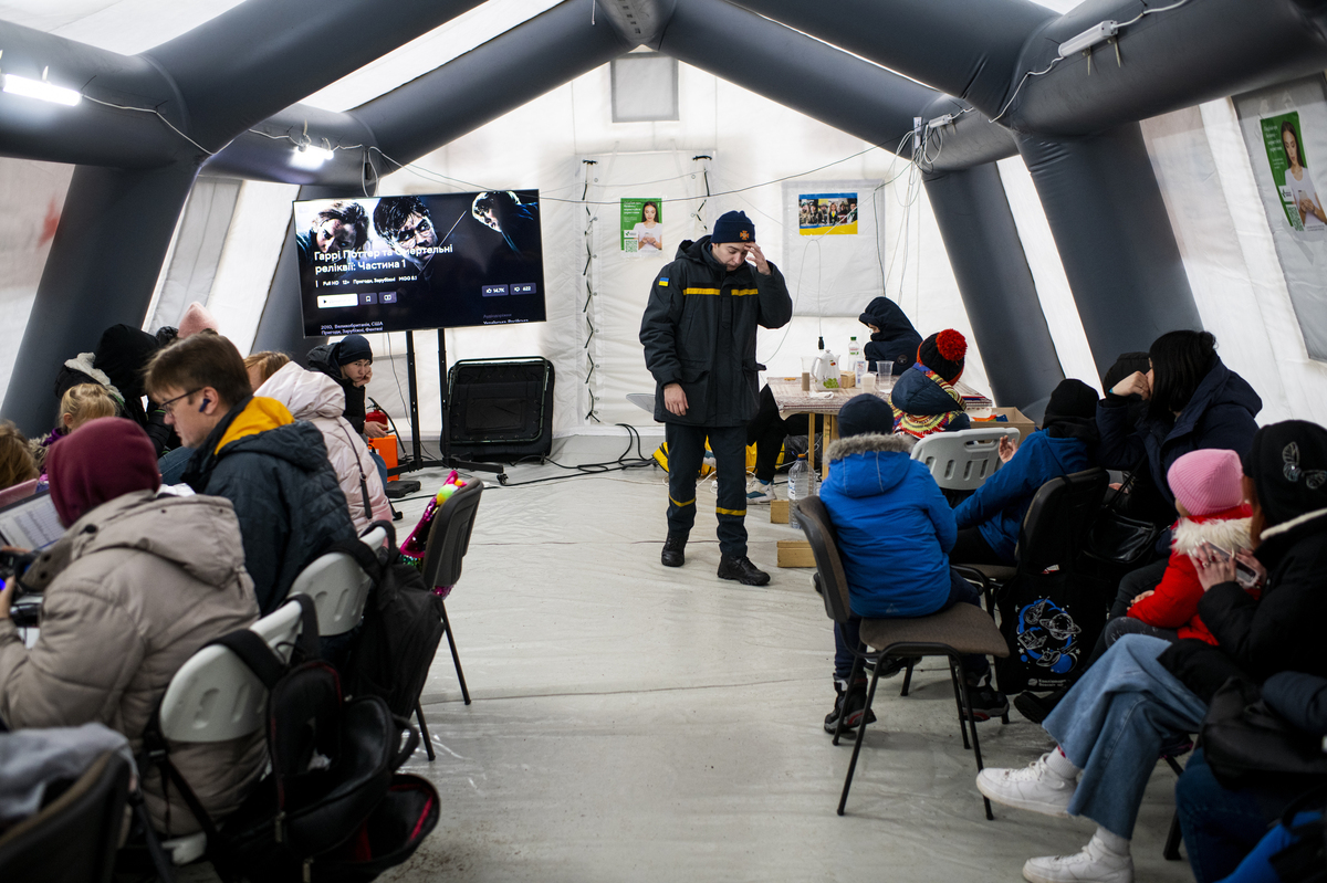 A tent set up by Ukrainian authorities offers shelter, heat, WiFi and charging stations to the public in Bucha on Dec. 2. Authorities refer to these tents as "points of invincibility" or "unbreakable centers."