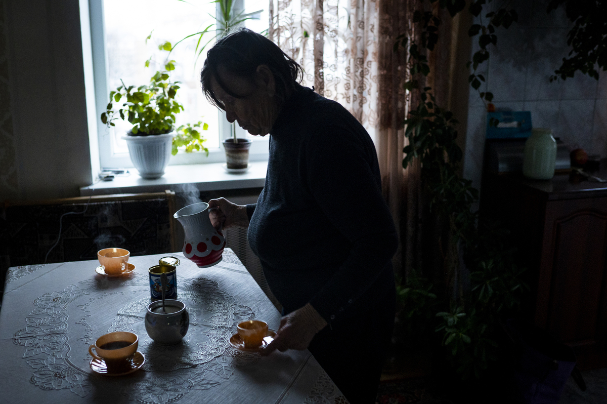 Raisa Yakymenko, 85, makes coffee in her apartment during a power outage in Bucha on Dec. 2.