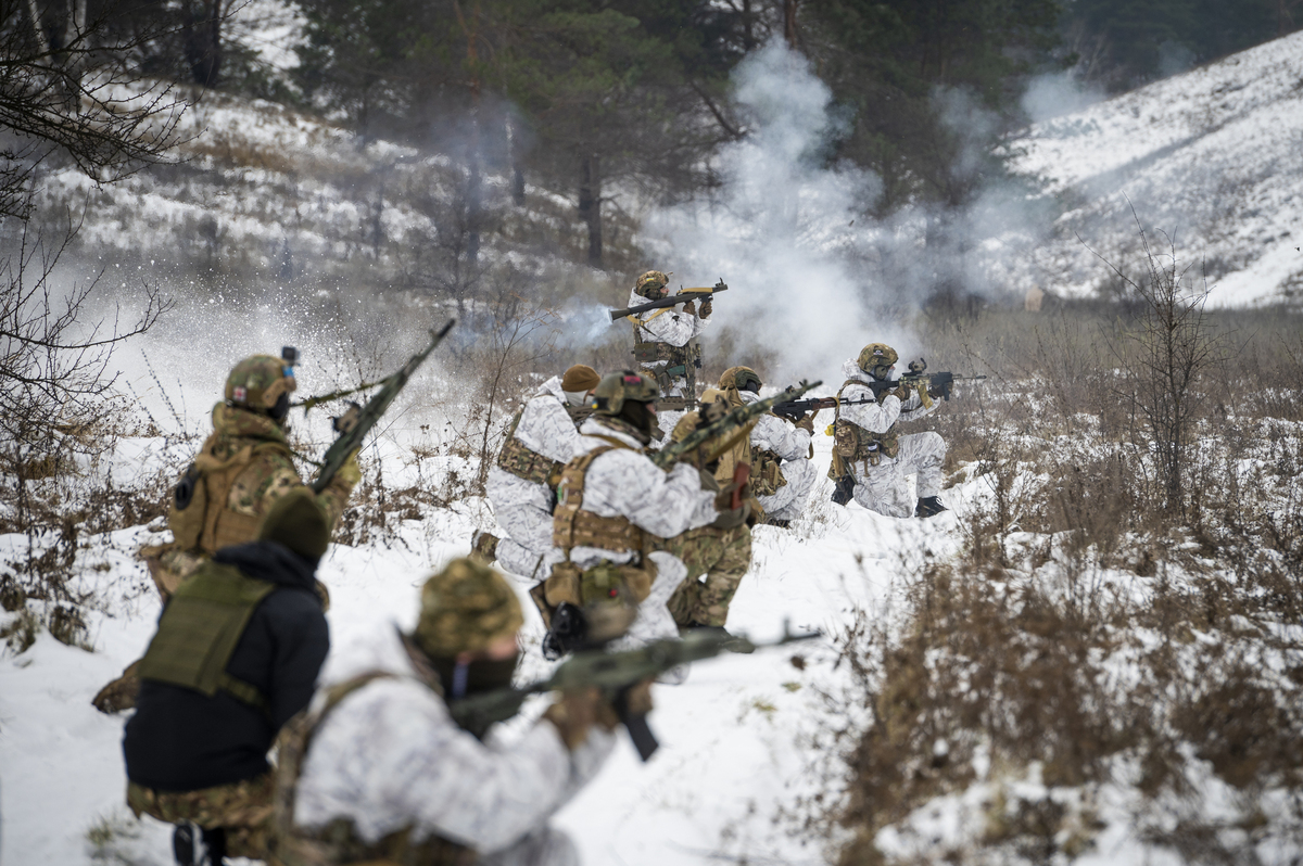 Members of Dzhokhar Dudayev Battalion train with new recruits on a hillside outside Kyiv on Dec. 3.