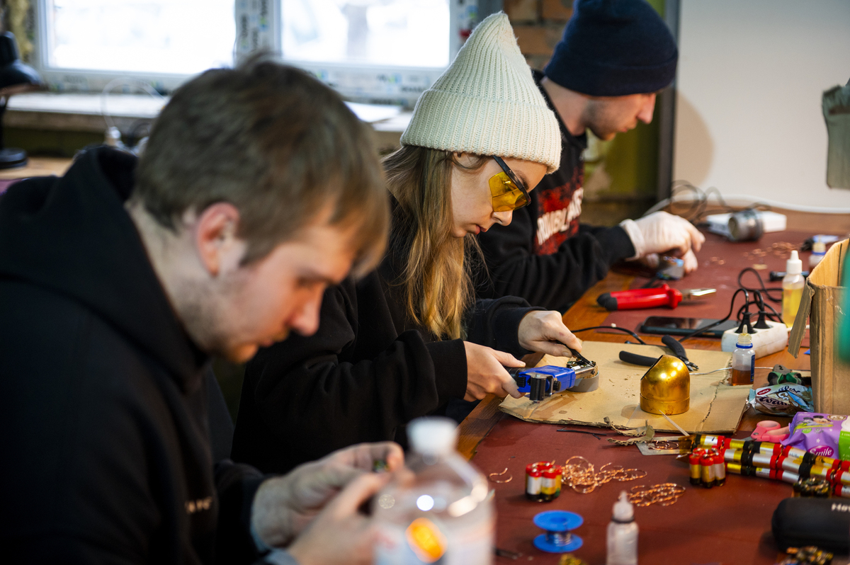 Volunteers with an organization called Power Kit assemble power banks from batteries recovered from disposable vape pens in Kyiv on Dec. 3. The group says it has received over 5 tons of donated vape pens, which are free to ship through Ukrainian delivery service Nova Poshta, and have created over 850 power banks, which are provided to the military for free. Pete Kiehart for NPR hide caption
