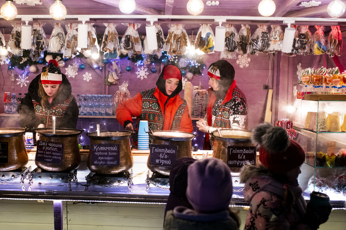 Vendors sell mulled wine at a Christmas market at VDNG, the Expocenter of Ukraine, in Kyiv on Dec. 3.