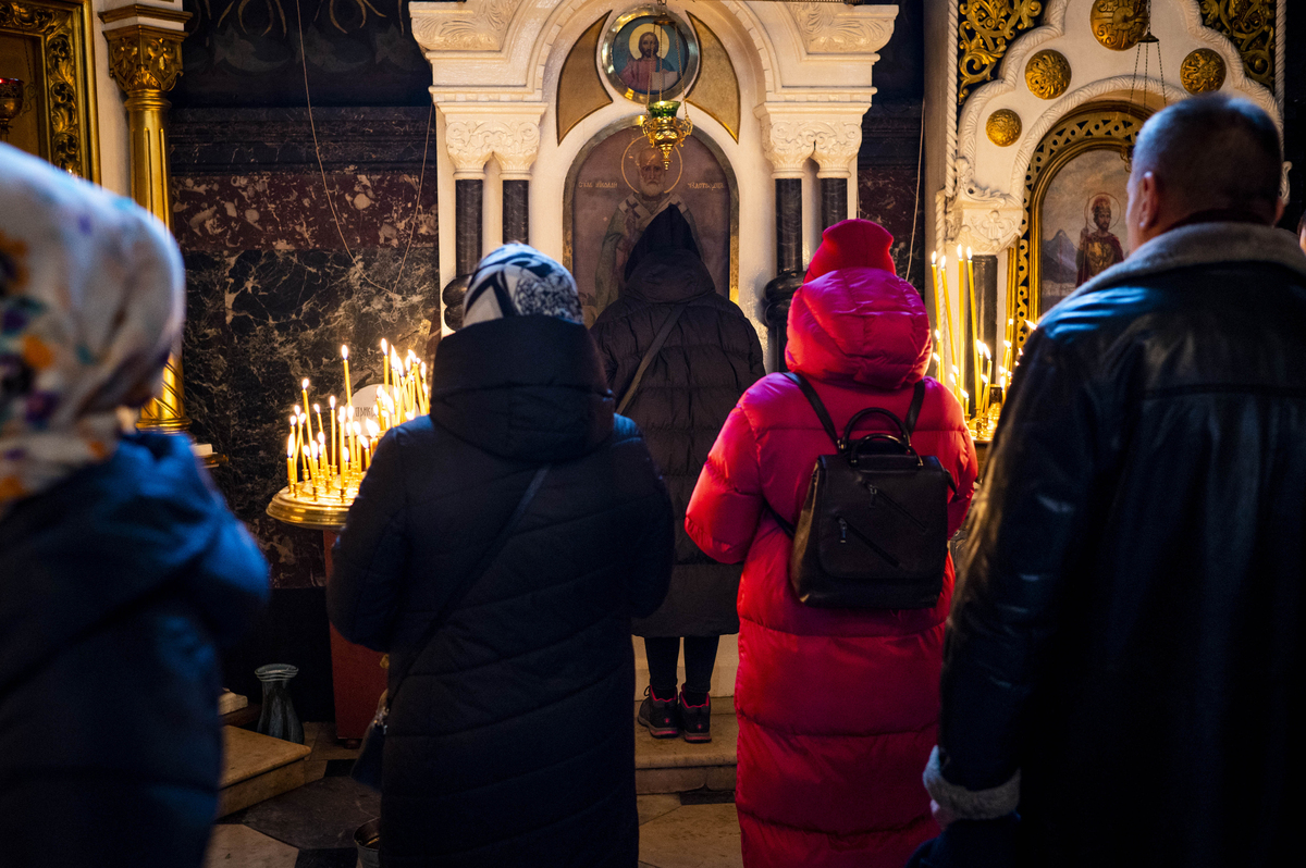 Worshipers wait to pray at icons during a Sunday Mass celebrating the Presentation of the Virgin Mary at St. Volodymyr's Cathedral in Kyiv on Dec. 4.
